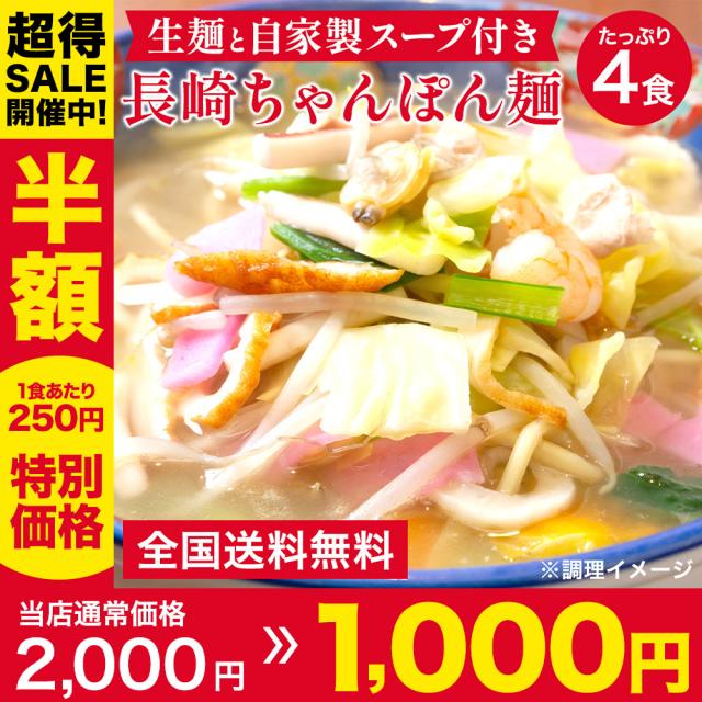 長崎ちゃんぽん 4食 送料無料 生麺 半生 ポイント消化 自家製スープ スープ付き ちゃんぽん 太麺 セット