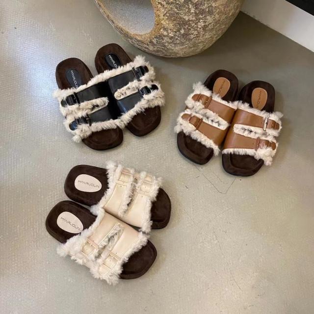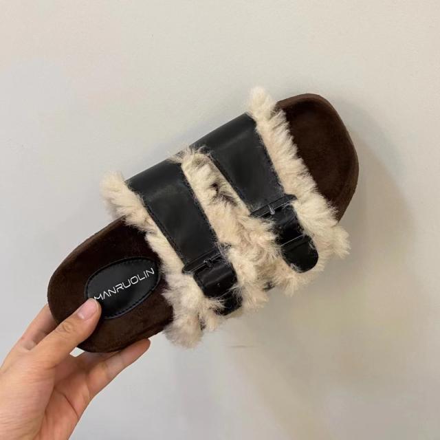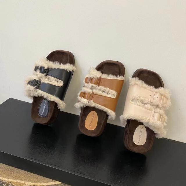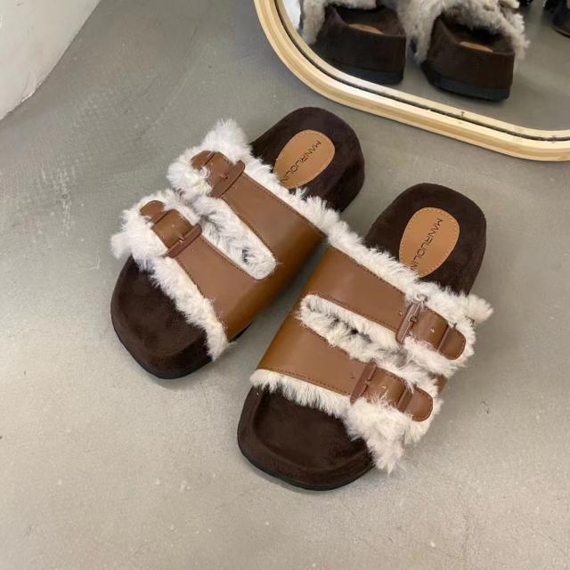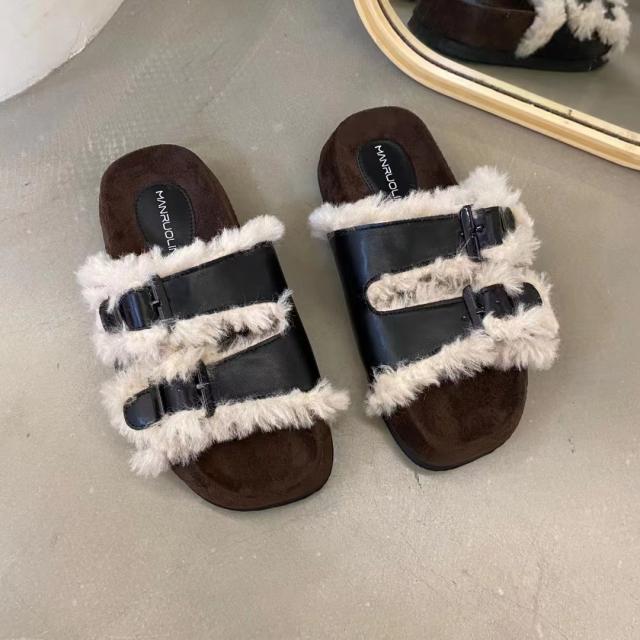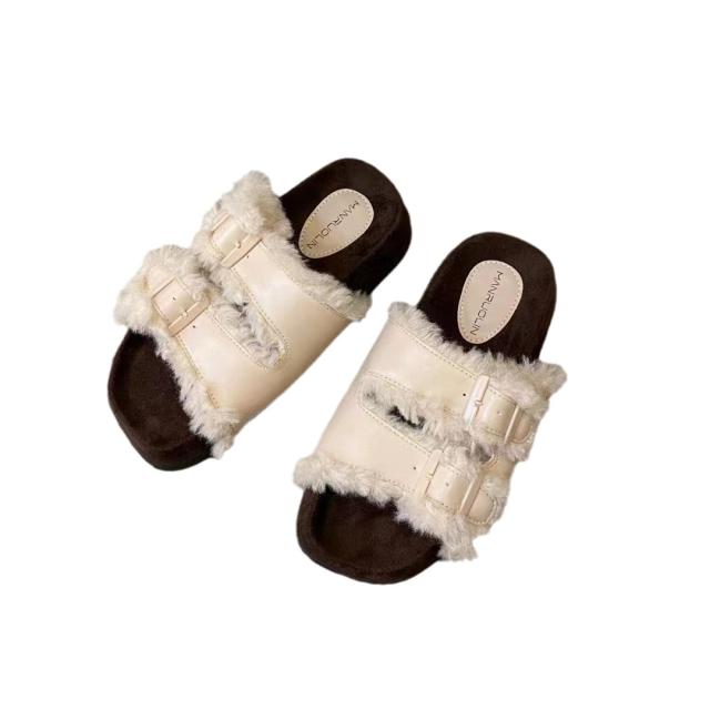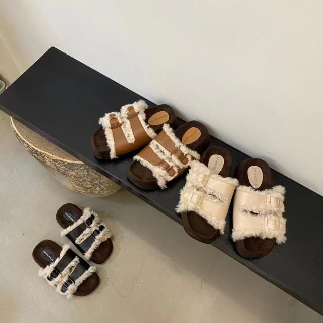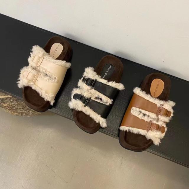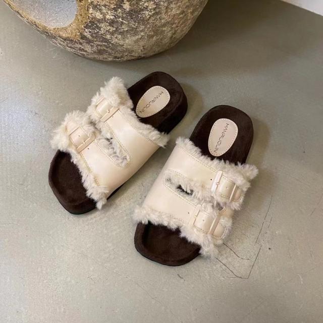 ボア厚底サンダル フラットソール 歩きやすい レディース ミュール 人造毛 滑り止め 春 秋 冬 ふわふわ モコモコ 韓国 お洒落 きれいめ