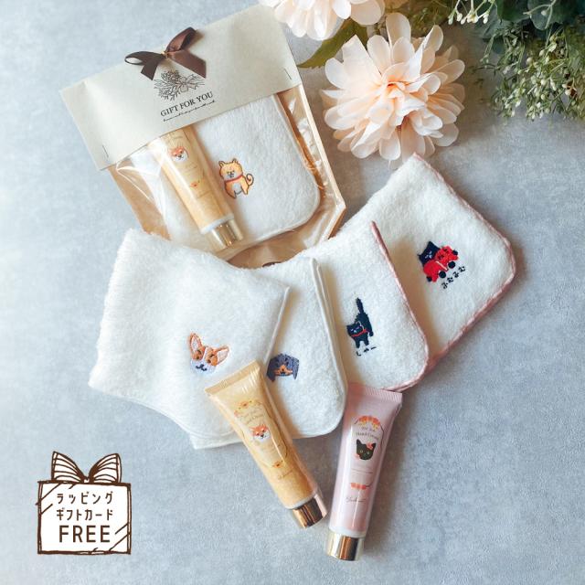 可愛いワンちゃん、ネコちゃんのハンカチ&ハンドクリームセット
