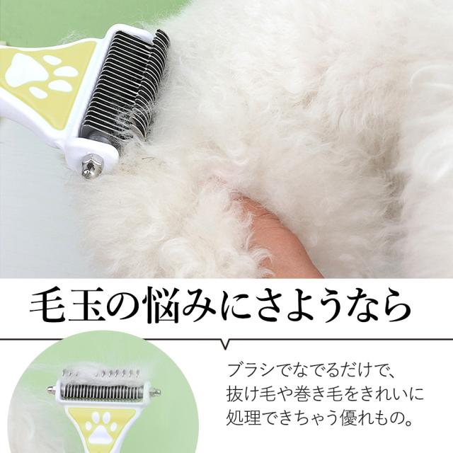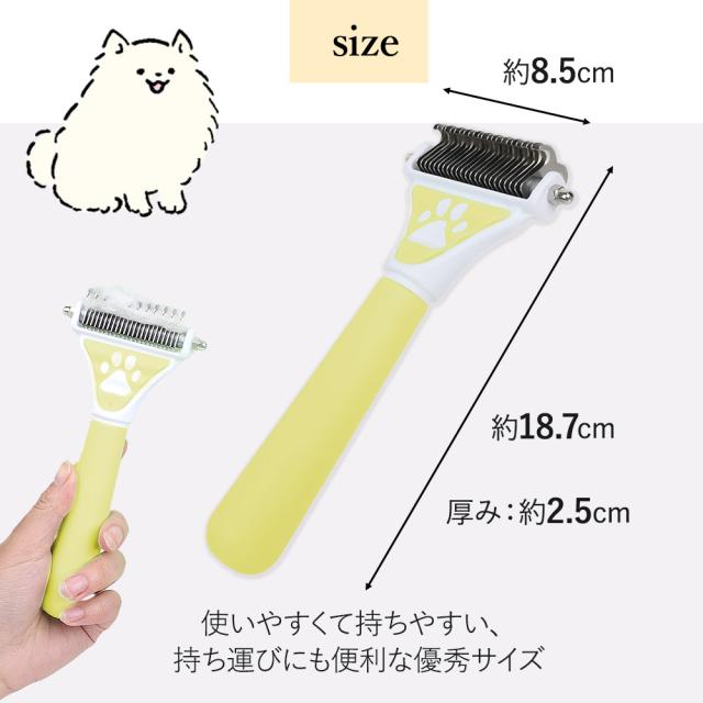- 毛玉が出来やすいトイプードルに使用しています。 軽く梳かしただけで毛玉が上手くカットされます。 ただ小型犬には大きく重いので使い勝手は少し悪く感じました。 もっと小さくて軽めだと小型犬にも使いやすいと思います。