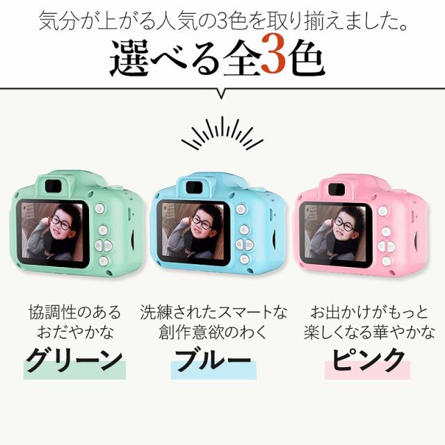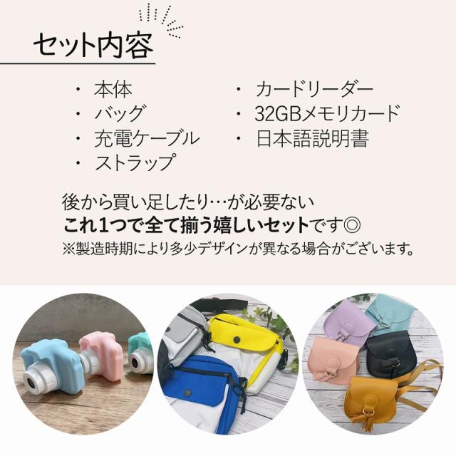 | 主な仕様 | 【カラー】 ピンク ブルー グリーン 【サイズ】 約8cm×約6cm×約1.5cm 【重量】 約59g 【セット内容】 本体、充電ケーブル、ストラップ、カードリーダー、32GBメモリカード、日本語説明書 2パターンから選べるバック付き(カラーは選べません。) 【仕様】 ・製造時期によってデザインが若干変わることもございます。 タイマー:3秒/5秒 ゲーム数:5個 撮影モード:10パターン フレーム数:15パターン 解像度:1080P ※ ストラップ、バッグはおまけのため交換対応はしていません。 ※ 本体、ケーブル、カードリーダー、メモリカードは初期不良のみ対応致します。 【機能】 静止画撮影、動画撮影、タイマーモード、ゲーム機能 |