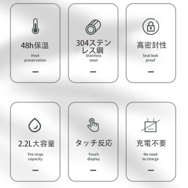 2.2Lの大容量で、一回のお湯を沸かすと家族全員の飲み水の需要を満たすことができます。頻繁にお湯を沸かす必要はなく、時間を節約できます。シンプルでユニークなデザインで、キッチンやデスクトップの装飾としても使用できます。日常的に持って使うと、アウトドアやキンプでも持っていけるおススメサイズの水筒です。コーヒーとお茶でもいれます。