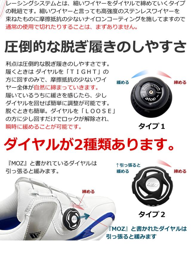 atopレーシングシステムとは、細いワイヤーをダイヤルで締めていくタイプの靴紐です。細いワイヤーと言っても高強度のステンレスワイヤーを束ねたものに摩擦抵抗の少ないナイロンコーティングを施してますので、通常の使用で切れたりすることは、まずありません。