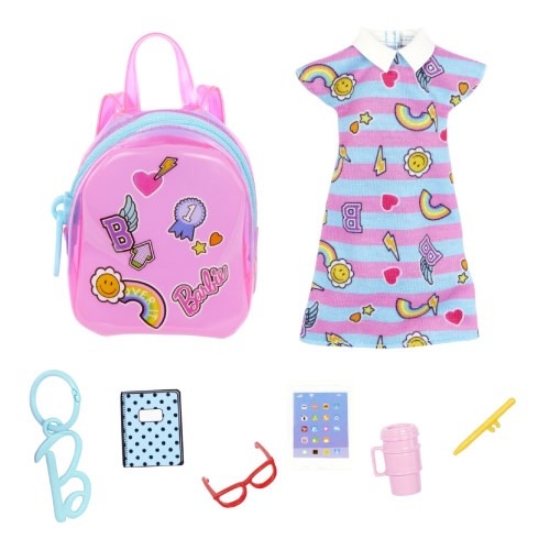 ストライプ柄とカラフルなグラフィックが特徴的なワンピース、メガネ、タブレット、ノート、ドリンク、ペンなど、学校をテーマにしたごっこ遊びにも最適です。