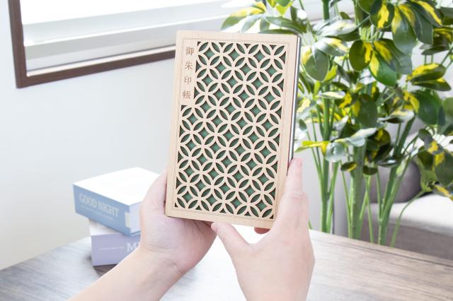 木の温もりが伝わる御朱印帳。表紙に繊細なレーザー加工を施しているため、細部まで華やかで美しい仕上がりとなっております。神社やお寺の御朱印を美しく飾ることができる、おすすめの商品です。