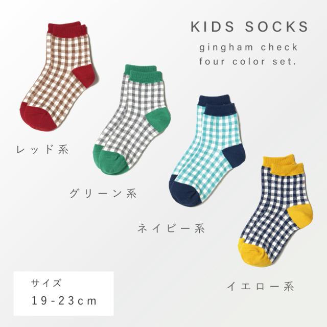 靴下,くつした,くつ下,ソックス,キッズ,子供,キッズ靴下,子ども,こども,ジュニア,男の子,男子,ボーイズ,女の子,女子,ガールズ,つま先,かかと,補強,丈夫,4足組,セット,おしゃれ,お洒落,オシャレ,ファッション,コーディネート,カジュアル,かわいい,可愛い,19-23cm,19cm,19センチ,20cm,20センチ,21cm,21センチ,22cm,22センチ,23cm,23センチ,チェック,ギンガムチェック,切替,レッド,赤,グリーン,緑,イエロー,黄色,ネイビー,紺,