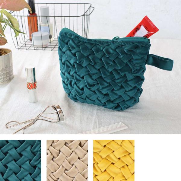 一見編んでいるようにも見える「スモッキング」デザインがおしゃれなポーチです。