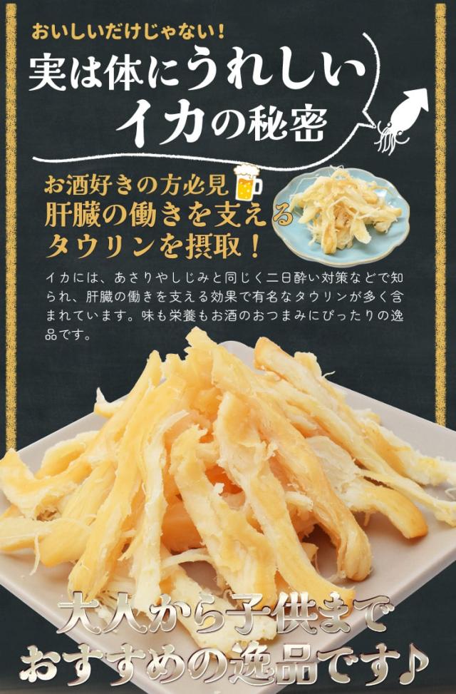 【原材料名】いか、砂糖、食塩、醸造酢/ソルビトール、酒精、酸味料、調味料(アミノ酸等)、メタリン酸Na、甘味料(ステビア、甘草)、保存料(ソルビン酸K)、(一部にいかを含む)