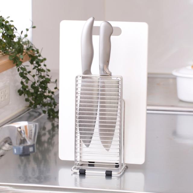置き場に困る包丁とまな板をセットですっきり収納できるスタンドです。包丁は最大2本、まな板2枚まで収納できます。風通しの良いワイヤー構造なので洗ったばかりの包丁やまな板の乾燥にも便利です。