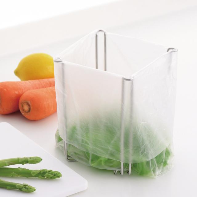 ポリ袋を掛けるだけで卓上でのごみ箱としてもお使いいただけます。調理中に出た生ゴミをそのまま捨てられるからシンク周りを汚さずに済みます。