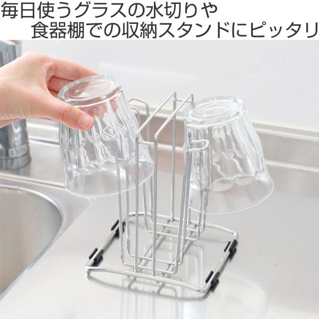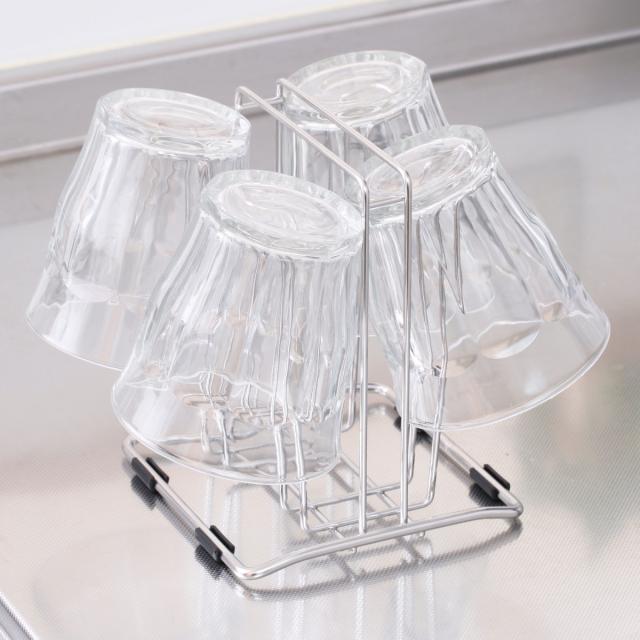 毎日使うグラスの水切りや収納に便利なグラススタンドです。空間を多くとらず、コンパクトに4個のグラスを収納できます。シンク周りや調理台・カウンター上での使用にピッタリ。また、収納スタンドとしても使用でき、棚の中でごちゃつきやすいグラスもすっきり収納できます。