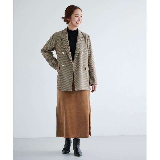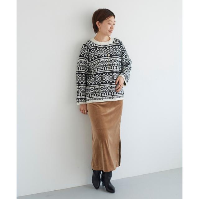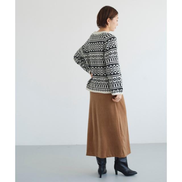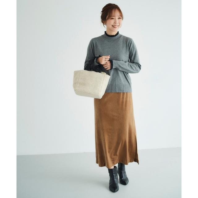 すっきりとしたニットやブラウスと合わせた大人フェミニンなスタイリング。