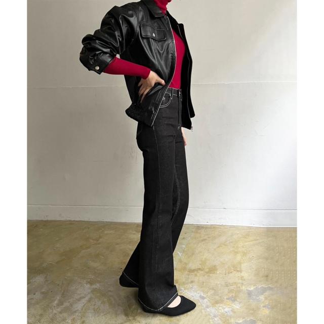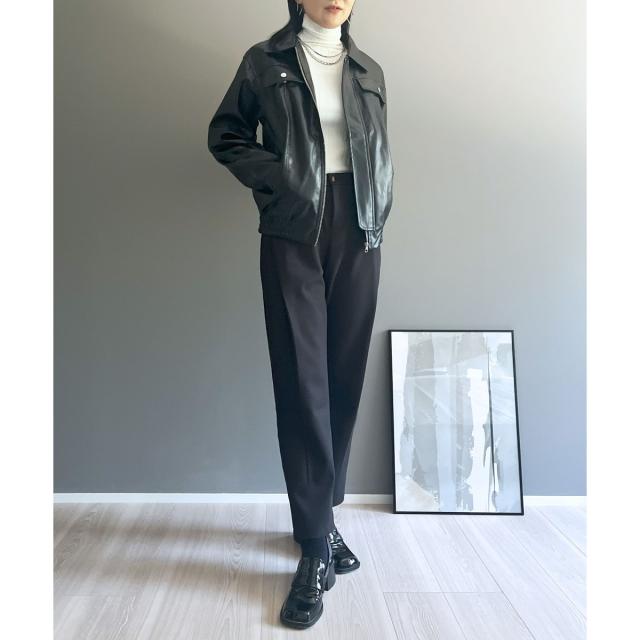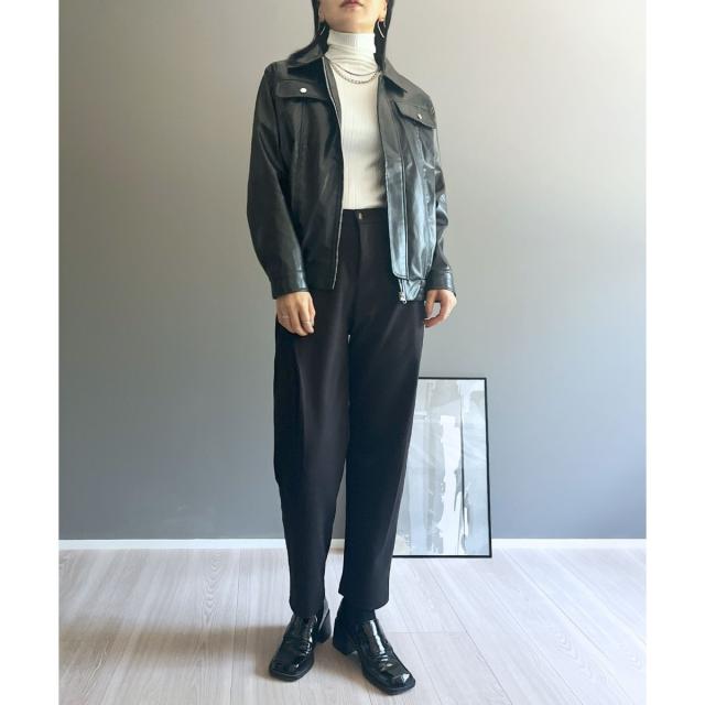 光沢感あるフェイクレザーを使用し、マニッシュな雰囲気に。