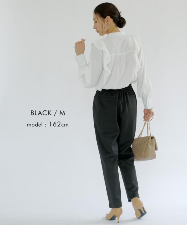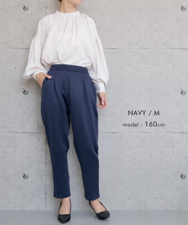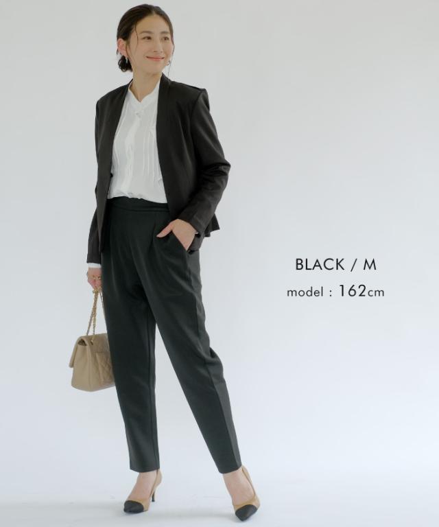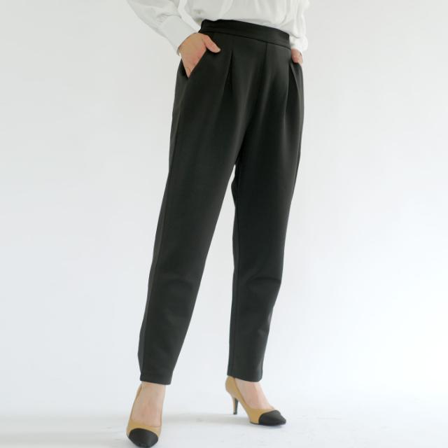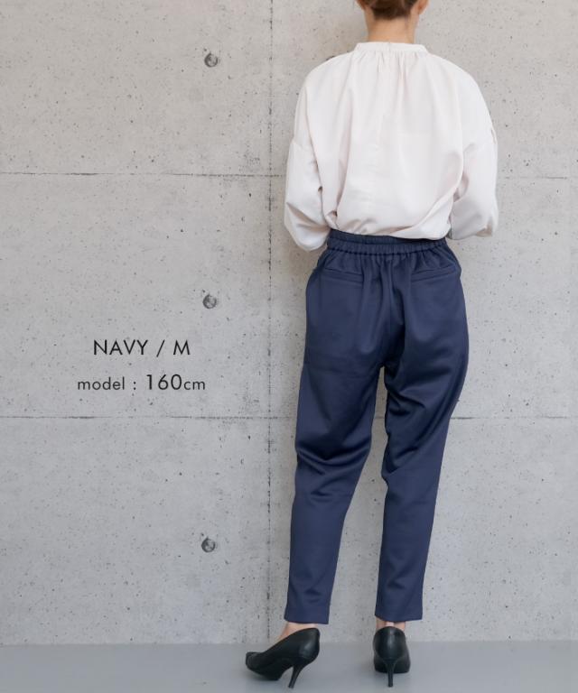 長時間穿いても疲れないストレスフリーなテーパードパンツ。 ウエストはバックゴム仕様で動きやすく、 オフィスにはもちろん、リモートワークにも使える優秀な一枚。