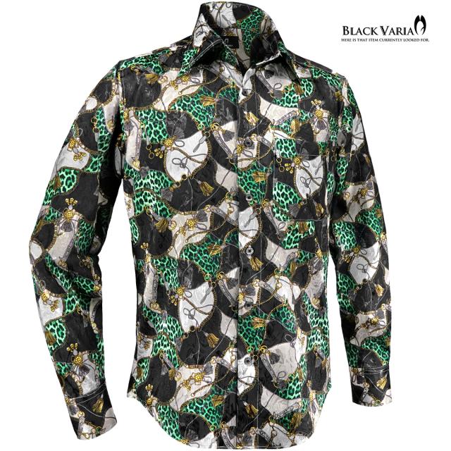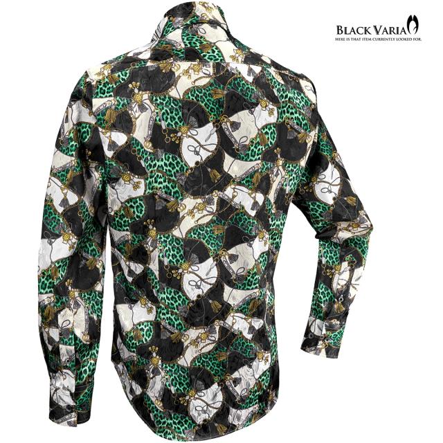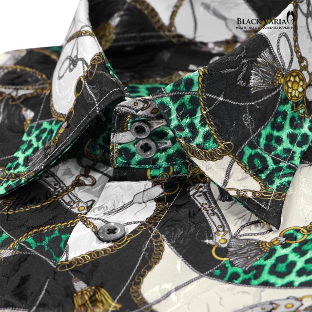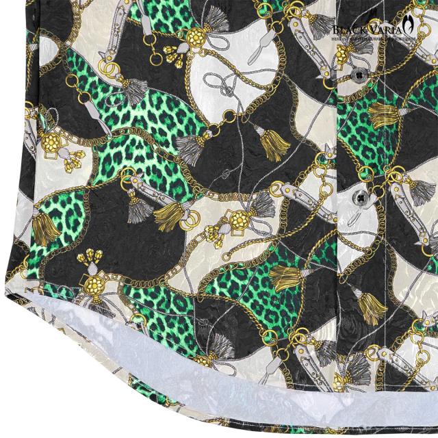 サテンシャツ ドレスシャツ レギュラーカラー メンズ ドゥエボットーニ チェーン柄 豹柄 ジャガード 日本製(グリーン緑ブラック黒) 181718