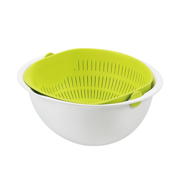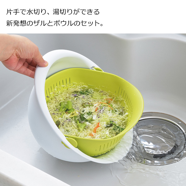 片手で水切り、湯切りができる新発想のザルとボウルのセット。