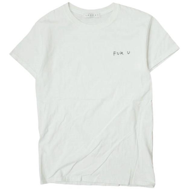 胸元に手縫いの「FUK U」と刺繍されたクルーネックTee。
