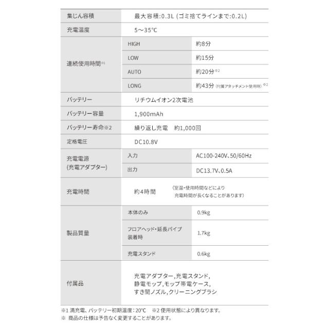 充電アダプター、充電スタンド、静電モップ、モップ帯電ケース、すき間ノズル、クリーニングブラシ