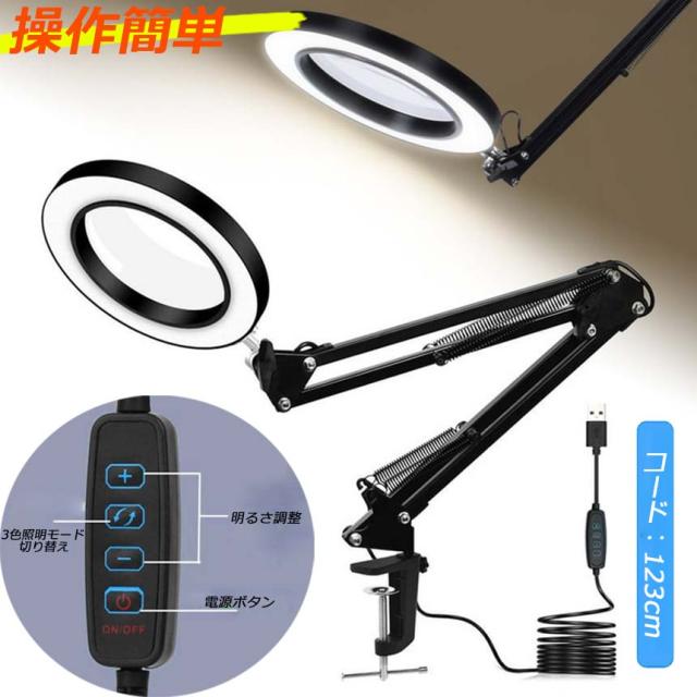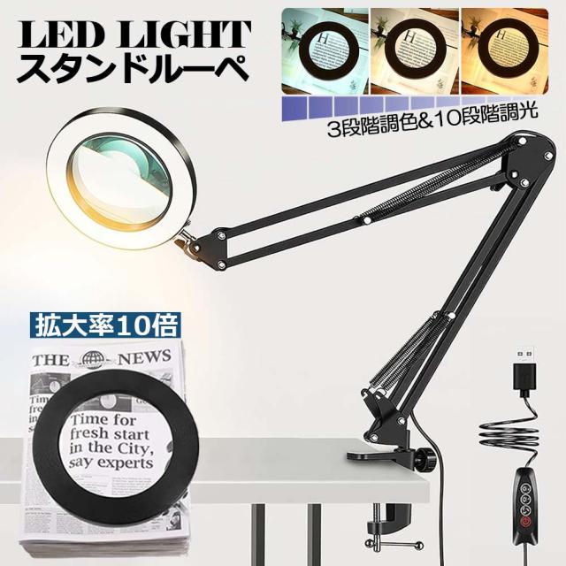 スタンドルーペ 拡大鏡 虫眼鏡 ルーペ デスクルーペ 作業用 LEDライト付き 3色無段階調光 明るさ調整 角度調整可能 折りたたみ式 倍率10倍 クリップ式 USB給電 固定 卓上型 手芸 読書用 高倍率 メガネ 省エネ 明るい 目に優しい