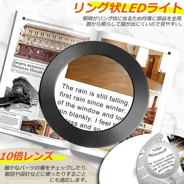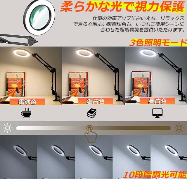 スタンドルーペ 拡大鏡 虫眼鏡 ルーペ デスクルーペ 作業用 LEDライト付き 3色無段階調光 明るさ調整 角度調整可能 折りたたみ式 倍率10倍 クリップ式 USB給電 固定 卓上型 手芸 読書用 高倍率 メガネ 省エネ 明るい 目に優しい