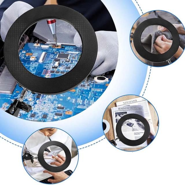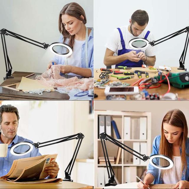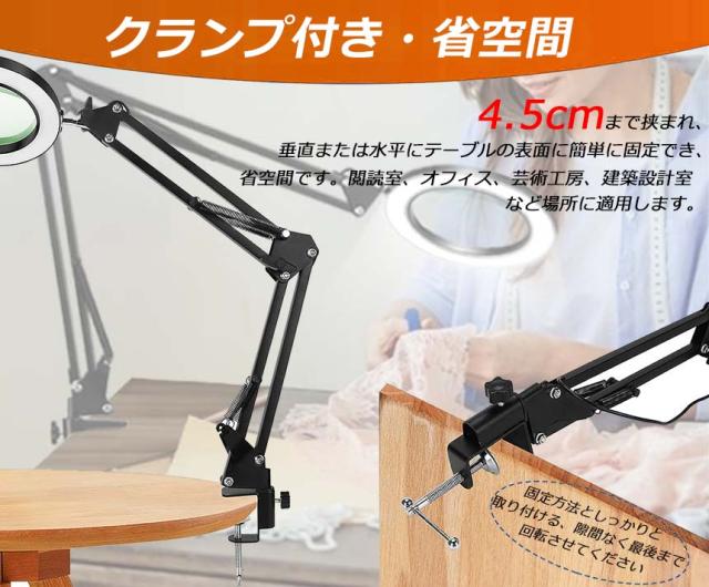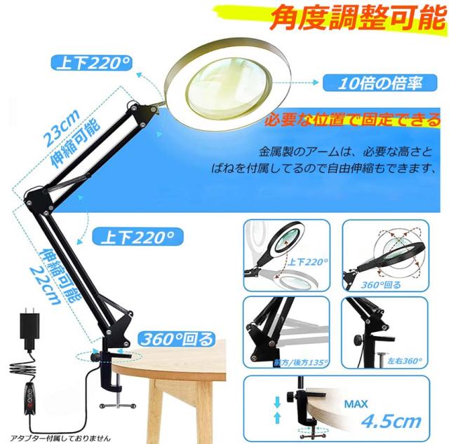 ●伸縮式アームとルーペのヘッド部が回転することができ、ルーペの角度やアームの長さ、高さを自由自在に調整できるスタンド●3色照明モードと10段階光量調節