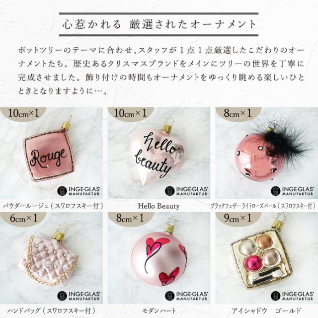 | 乙女心をくすぐるレディライクなツリー わたしに必要なエッセンスをふんだんに散りばめて わたしらしく、ありのままに。 リッチな気分を高めてくれる スワロフスキークリスタルの上品な煌めき。 このくらいが丁度いい。自分のために飾れる、クリスマスツリーができました。 雰囲気の違うポットツリーを多数ご用意。 オーナメントなど1点1点厳選し、トータルコーディネートしています。 環境やライフステージの変化にも調和できるよう、 華やかさはそのままに、サイズを少し小ぶりにしました。 忙しい時間の中でも、ちゃんと自分自身を見つめ直し、長く思い出を紡いでいけるようなそんなツリーになると嬉しいです。 世界を代表するオーナメントブランドから厳選した、最高級のオーナメント。 【INGE-GLAS Manufaktur】 【INGE-GLAS MAGIC】 【INGE-GLAS GOODS】 歴史ある高級オーナメントブランドをメインに、一からデザインしたオリジナルアイテムを交えハイクラスのデコレーションツリーを目指しました。 品質の高さとこだわりで、クリスマスツリーに価値ある輝きをプラスします。 考えぬかれたトータルコーディネート フルセットでお届けします ポットツリーはクリスマスツリーに必要なアイテムを全てセットにしました。あれこれ買い足す必要がなく、届いたその日からすぐに飾れる豪華なツリーセットです。「自分のためのクリスマスツリー」を思う存分お楽しみください。 ラインが美しいボリュームたっぷりのツリー 2種類の形や濃淡の違う葉をミックスすることでボリュームあるクオリティの高いツリーに仕上げました。 枝葉の密度があるので、お好みの位置にオーナメントをレイアウトすることが可能です。後ろ側のボリュームは抑えめにすることで、壁面に近づけて飾れる省スペース設計です。 奥行きが狭い場所でも気軽に飾れるようにツリーの背面のボリュームは抑え、薄型のツリーに仕上げました。 心惹かれる厳選されたオーナメント ポットツリーのテーマに合わせ、スタッフが1点1点厳選したこだわりのオーナメントたち。歴史あるクリスマスブランドや、弊社オリジナルのオーナメントを交えながらツリーの世界を丁寧に完成させました。飾り付けの時間もオーナメントをゆっくり眺める楽しいひとときとなりますように…。 アンティーク調カップ型ポット[ブラック] 荘厳でゴシック調ながらアンティークの雰囲気漂うスクエア型ポット。甘くなり過ぎないマットブラックがツリー全体をシックに引き締め、オーナメントをより美しく演出します。 ※掲載している商品画像のオーナメントは前面を中心に飾り付けたイメージです。 |
