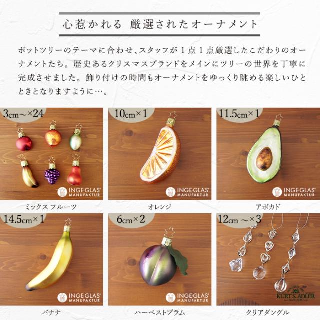 | スタイリッシュな大人ムードが叶う。 上質なオーナメントで彩る みずみずしく洗練された佇まい。 大人の品格に遊び心を添えて 等身大の輝きを。 このくらいが丁度いい。自分のために飾れる、クリスマスツリーができました。 雰囲気の違うポットツリーを多数ご用意。 オーナメントなど1点1点厳選し、トータルコーディネートしています。 環境やライフステージの変化にも調和できるよう、 華やかさはそのままに、サイズを少し小ぶりにしました。 忙しい時間の中でも、ちゃんと自分自身を見つめ直し、長く思い出を紡いでいけるようなそんなツリーになると嬉しいです。 世界を代表するオーナメントブランドから厳選した、最高級のオーナメント。 【INGE-GLAS Manufaktur】 【GOODWILL】 【Kurt S.Adler】 歴史ある高級オーナメントブランドをメインに、一からデザインしたオリジナルアイテムを交えハイクラスのデコレーションツリーを目指しました。 品質の高さとこだわりで、クリスマスツリーに価値ある輝きをプラスします。 考えぬかれたトータルコーディネート フルセットでお届けします ポットツリーはクリスマスツリーに必要なアイテムを全てセットにしました。あれこれ買い足す必要がなく、届いたその日からすぐに飾れる豪華なツリーセットです。「自分のためのクリスマスツリー」を思う存分お楽しみください。 ラインが美しいボリュームたっぷりのツリー 2種類の形や濃淡の違う葉をミックスすることでボリュームあるクオリティの高いツリーに仕上げました。 枝葉の密度があるので、お好みの位置にオーナメントをレイアウトすることが可能です。後ろ側のボリュームは抑えめにすることで、壁面に近づけて飾れる省スペース設計です。 奥行きが狭い場所でも気軽に飾れるようにツリーの背面のボリュームは抑え、薄型のツリーに仕上げました。 心惹かれる厳選されたオーナメント ポットツリーのテーマに合わせ、スタッフが1点1点厳選したこだわりのオーナメントたち。歴史あるクリスマスブランドや、弊社オリジナルのオーナメントを交えながらツリーの世界を丁寧に完成させました。飾り付けの時間もオーナメントをゆっくり眺める楽しいひとときとなりますように…。 アンティーク調カップ型ポット[ゴールド] 長年使い込まれたようなシャビーな風合いが高級感と重厚感を演出しながらも華美になりすぎない上品なデザインに仕上げました。オーナメントの魅力を際立たせるカップ型のポットです。 ※掲載している商品画像のオーナメントは前面を中心に飾り付けたイメージです。 |