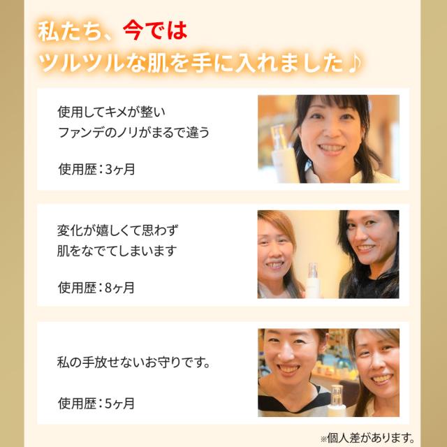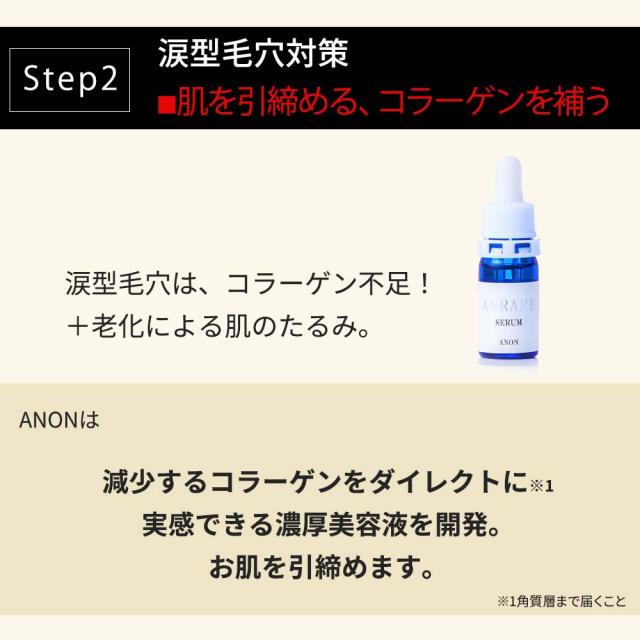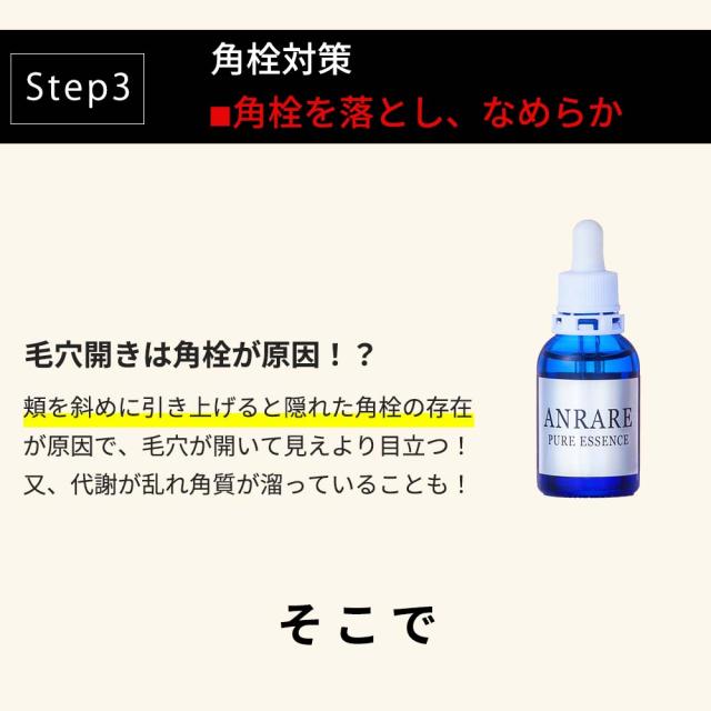 | 使用方法 | 洗顔後、一番初めにクリスタルローションをご使用ください。 2度づけをご提案しています。 ・1度目 手のひらに「500円玉」 手のひらにひろげ 顔全体にやさしく包みこみ押えこむ ・2度目 手のひらにワンプッシュ 特に目のまわり、小鼻、頬の毛穴などの細やかな部位をやさしくていねいに! 2度繰り返すことでしっかりうるおいます。 ローション後は、ピュアエッセンスをご使用ください。 【使用タイミング】晩 ・お肌全体 >月7日間のケアまで ※目の回りの皮膚の薄い場所は、必ず避けてください。 気になる部位は2度づけ。 お肌の不要な角質をなめらかに保ちます。 今を超える美肌へ。ピュアエッセンス(日本初成分、22年12月弊社のみ) 3番目につけるアンレアセラム 2番目につけたピュアエッセンスで不要な皮脂、角質をなめらかにします。 次に必要なのが肌の引締めが必要です。 【使用タイミング】朝晩 ・頬の毛穴、穴の毛穴への部分使い。 セラムは、濃密でスーッとすごく伸びがいいのでまず半滴〜1滴を指先で 頬の毛穴、鼻の毛穴部分に丁寧になじましましょう ・コラーゲンを与える ・根本からうるおわせる ・肌を引締め ・キメを整える 臨床試験を優れた有用性の2種類の成分だけを特化。 国内最高濃度を誇ります。 (22年12月弊社調べ) コツコツと丁寧な積み重ねで未来のお肌をなめらかさを手にしましょう。 |