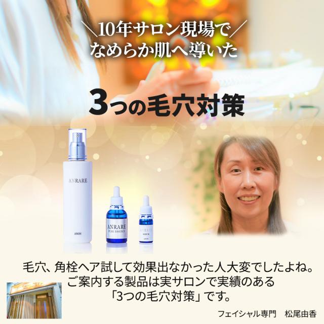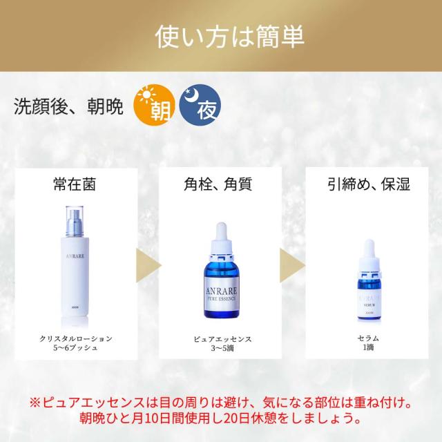 | 内容量 | ANRARE クリスタルローション:120ml ANRARE アンレアセラム:5ml ANRARE ピュアエッセンス:20ml |