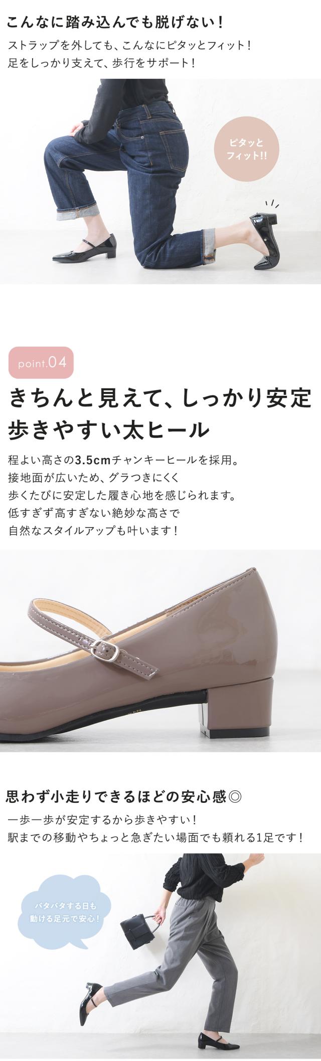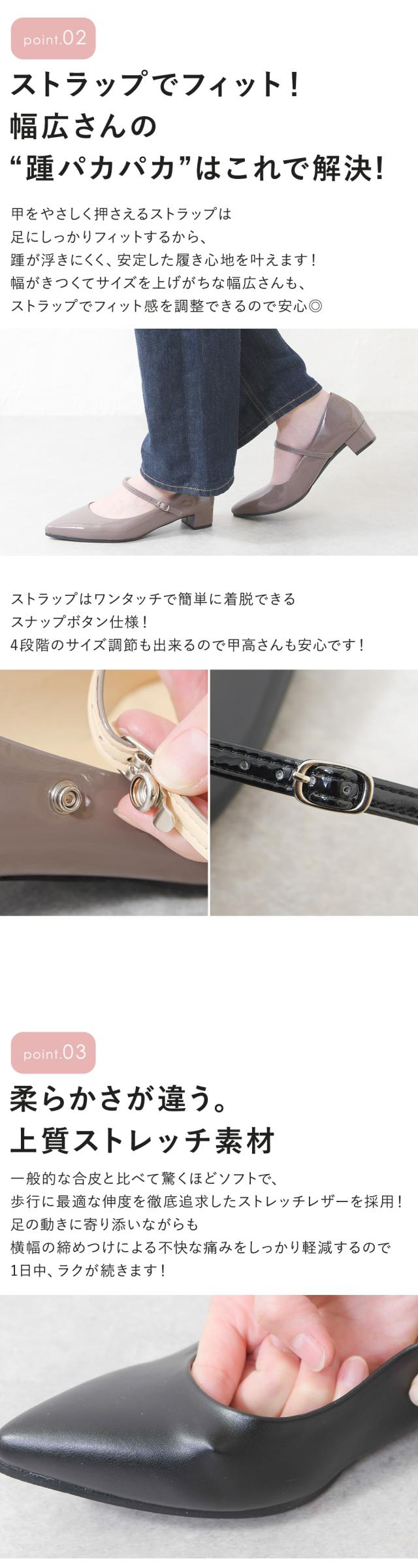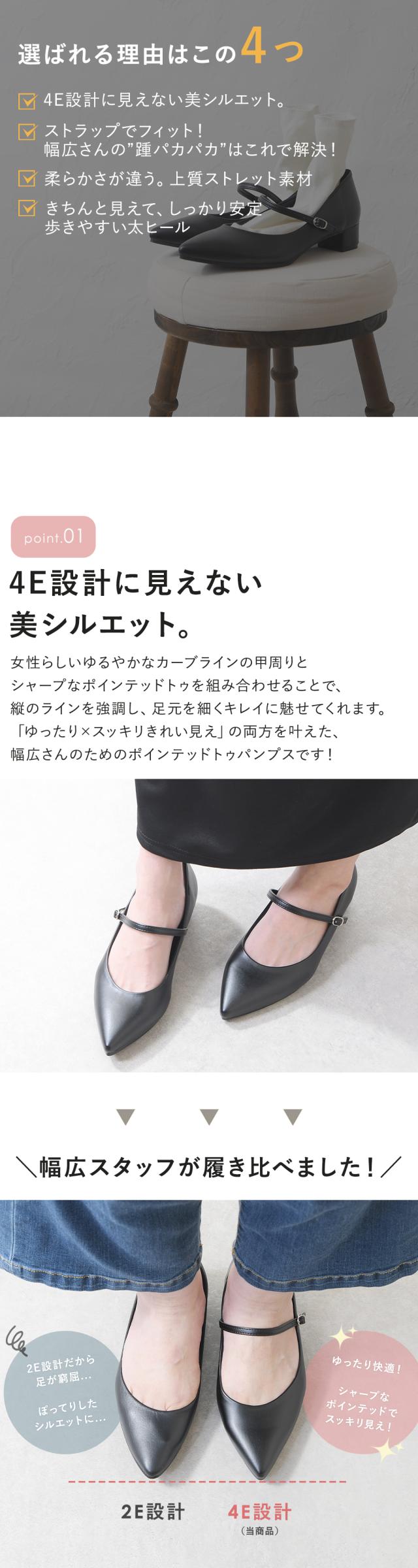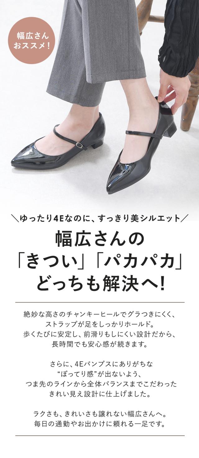 パンプス 幅広 4E ストラップ ポインテッドトゥ ローヒール 太ヒール チャンキーヒール 痛くない 柔らかい 疲れない 歩きやすい 軽量 走れる フォーマル スーツ 仕事用 通勤 立ち仕事 冠婚葬祭 結婚式 日本製 大きいサイズ 黒 ブラック 秋新作