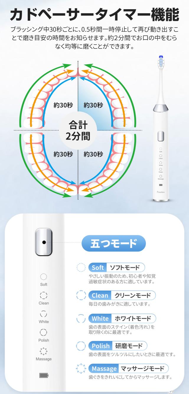 ブラッシング中30秒ごとに、0.5秒間一時停止して再び動き出すことで磨き目安の時間をお知らせる。約2分間でお口の中をむらなく均等に磨くことができる。