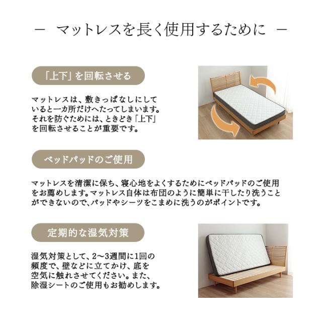 | ※マットレスの水洗いはお避けください。マットレスが汚れた場合、薄めの石鹸水をつけた布で軽く叩くように拭き取り、日陰に干して下さい。 ※臭いが気になる場合は、風通しの良いところで日陰干しをすると多少解消されます。 ※マットレスの上や下に、除湿シートを敷いている場合は、除湿効果を持続させるためにも、2〜3週間に1回の頻度で取り出し、天日干しするとよいでしょう。 また、マットレスの裏側にも湿気は溜まります。同じく2〜3週間に1回の頻度で、壁などに立てかけ、マットレスの底を空気に触れさせてください。 ※無理に折り曲げないでください。 ※マットの上で飛んだり跳ねたりしないでください。 |