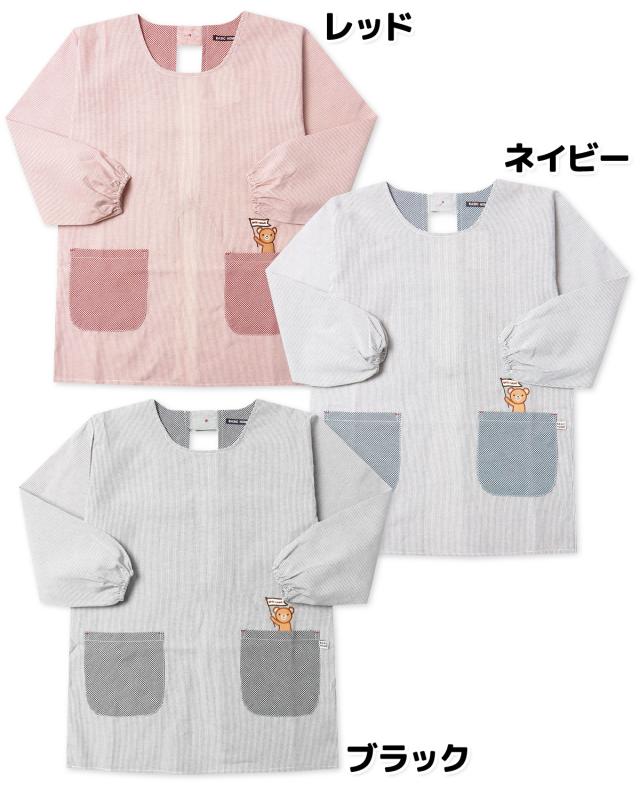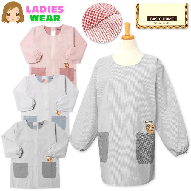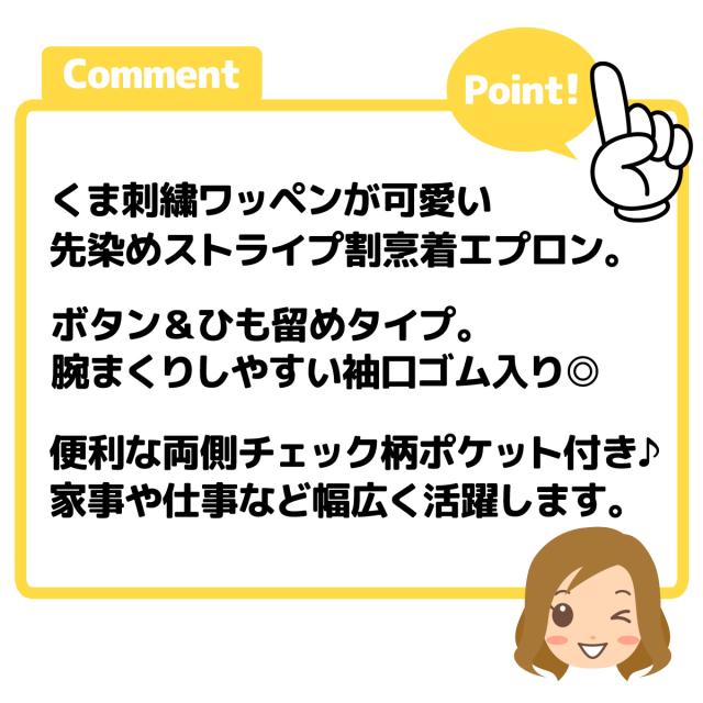【送料無料】婦人 レディース 割烹着 エプロン 後ろボタン&ひも留め 先染めストライプ くま sl-0316【メール便対応】