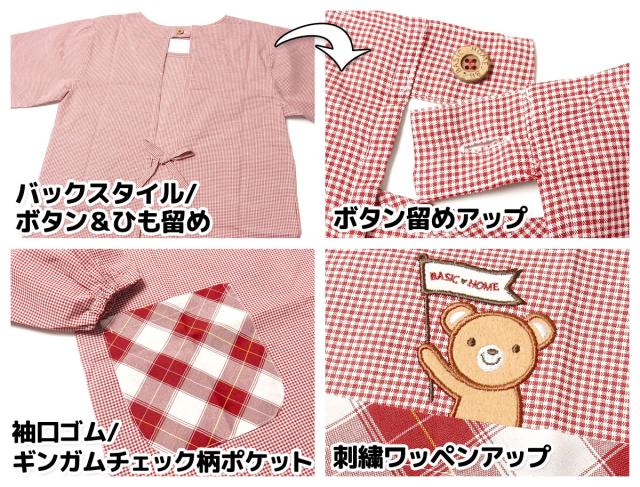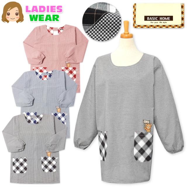 【送料無料】婦人 レディース 割烹着 エプロン 後ろボタン&ひも留め 先染めギンガムチェック柄 くま sl-0317【メール便対応】