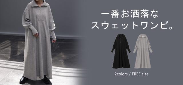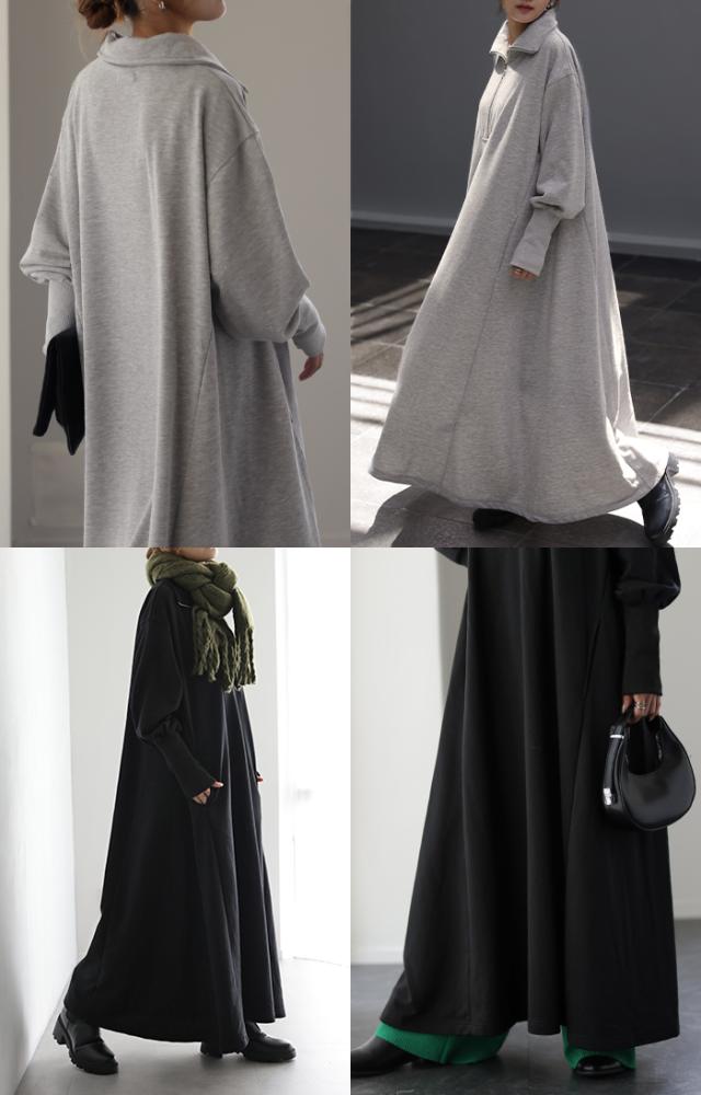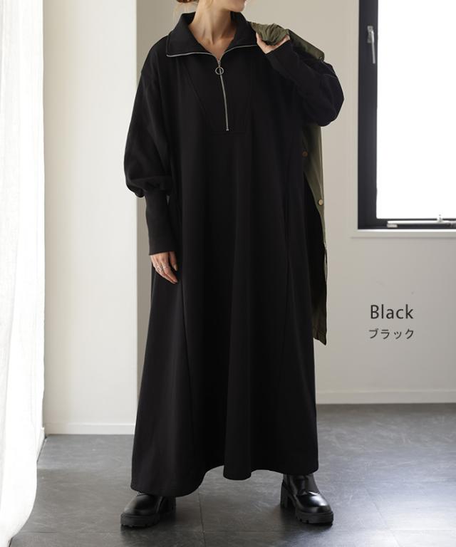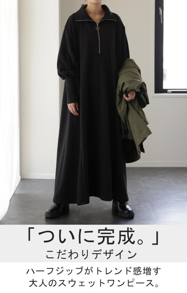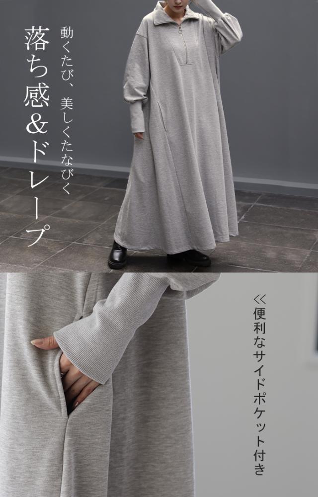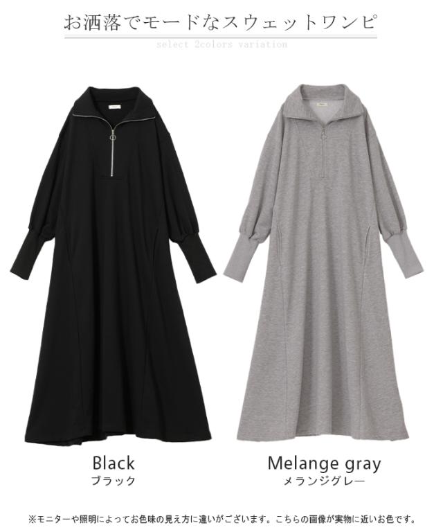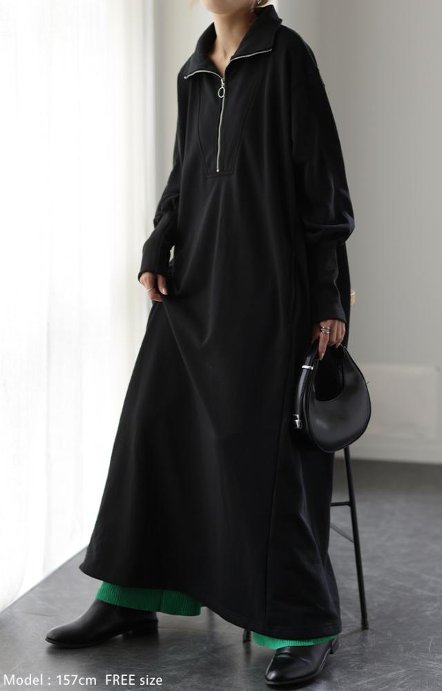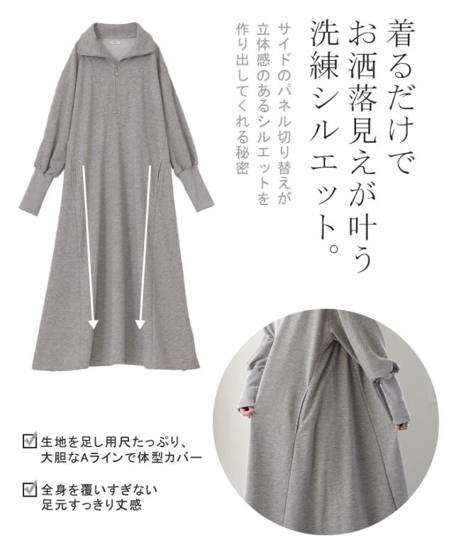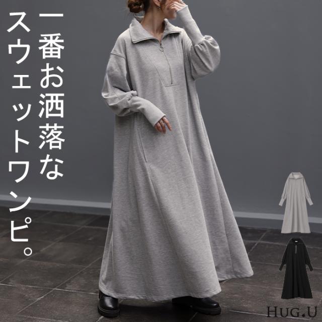 1番お洒落。「 ハーフジップ 」 スウェット ワンピ ワンピース ロングワンピース レディース ロング ロングワンピ マキシ Aライン 長袖 スエット トレーナー パーカーワンピース ジップ ぽわん袖 二の腕カバー 大きいサイズ グレー 黒 秋 夏 HUG.U 秋新作