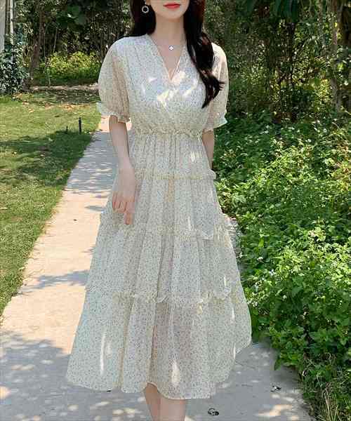 レディース 半袖小花柄ティアードフリルウエストゴムワンピース