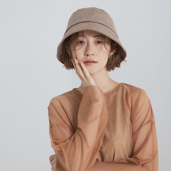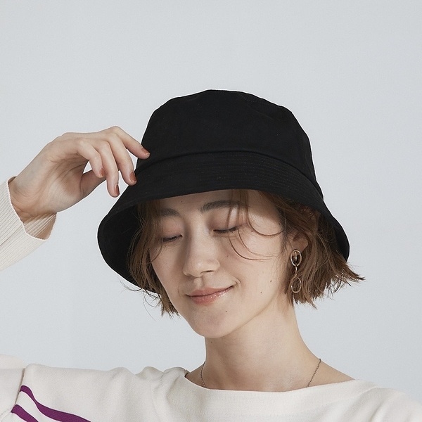 トレンドのダウンブリムのバケットハット。ゆったり目のサイズ感です。