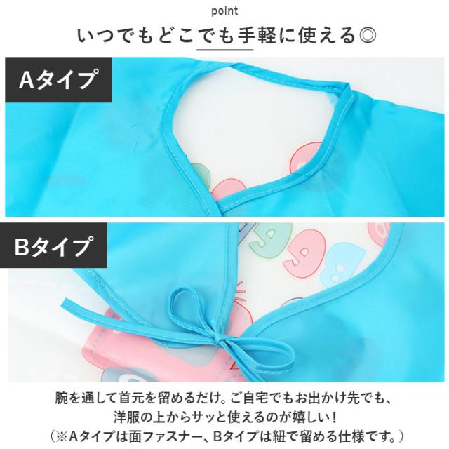 | 商品説明 | ・食べこぼしの汚れからお洋服を守る!お食事エプロンが新登場。 【いつでもどこでも手軽に使える◎】 ・腕を通して首元を留めるだけ。ご自宅でもお出かけ先でも、洋服の上からサッと使えるのが嬉しい!(※Aタイプは面ファスナー、Bタイプは紐で留める仕様です。) 【腕までガードする長袖タイプ】 ・腕まわりの汚れもしっかりガード!袖口はギャザーゴム入りで、腕まくりもラクラク。 【持ち運びに便利】 ・折りたためばスリム&コンパクト。お出かけ用のバッグにかさばることなく、忍ばせておけちゃう! 【お手入れラクラク】 ・汚れが染み込みにくくすぐに拭き取れて、手洗いOK。いつも清潔に保てるアイテム。(※漂白剤の使用はお避けください。) 【可愛らしいデザイン】 ・遊び心のある、アニマルなどの絵柄がキュート。毎日のお食事が、より楽しくなりそう♪ |