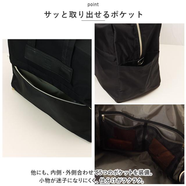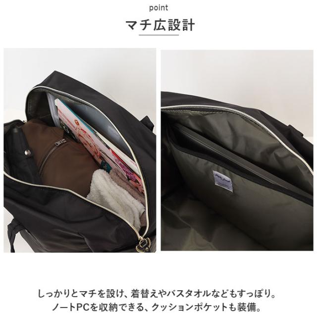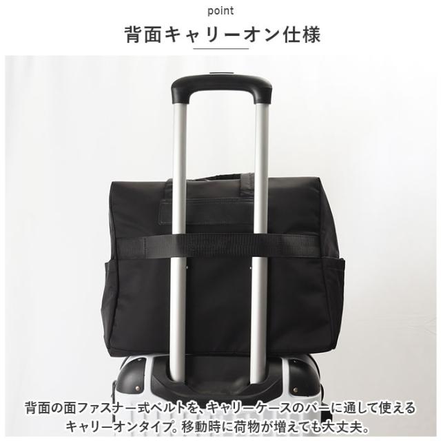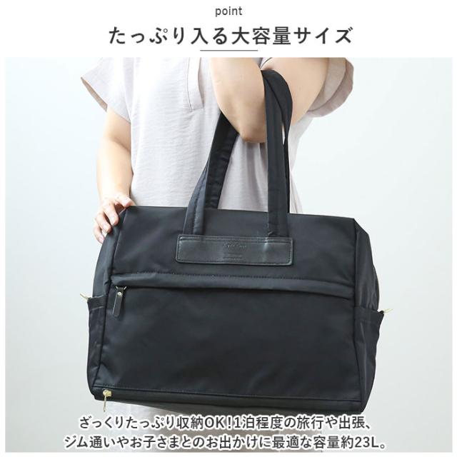 | 商品説明 | ・使い勝手が良く、様々なシーンで大活躍!Legato Largoから収納力ばっちりな、撥水ナイロン製の2WAYボストンバッグが新登場。 【たっぷり入る大容量サイズ】 ・ざっくりたっぷり収納OK!1泊程度の旅行や出張、ジム通いやお子さまとのお出かけに最適な容量約23L。 【ダブルファスナー開口】 ・メインルーム開口部は、左右どちらからも開閉できるダブルファスナー式。ガバっと大きく開いて中身が見やすく、出し入れもスムーズ。 【マチ広設計】 ・しっかりとマチを設け、着替えやバスタオルなどもすっぽり。ノートPCを収納できる、クッションポケットも装備。 【便利な底面ポケット】 ・底面には、持ち運び用の靴などを入れておけるポケットを配置。衣類やメインルームの荷物と分けたいときに♪ 【サッと取り出せるポケット】 ・他にも、内側・外側合わせて5つのポケットを装備。小物が迷子になりにくく、仕分けがラクラク。 【ちょっとの雨なら大丈夫】 ・表面に水滴や汚れを弾く、はっ水加工済み。お手入れも拭き取るだけ!(※完全防水ではありません。) 【持ち方自在】 ・持ち手は肩掛けしやすい長さに設計されており、トートのように持ち歩ける!長さ調節可能なショルダーベルトを取り付けて、肩掛け・斜め掛けも。 【体に優しいつくり】 ・背面にはウレタン入りで、からだ当たりが優しいのもポイント。 【背面キャリーオン仕様】 ・背面の面ファスナー式ベルトを、キャリーケースのバーに通して使えるキャリーオンタイプ。移動時に荷物が増えても大丈夫。 【選べるカラー】 ・落ち着きのあるカラーをラインナップ。コーデを選ばず使える、シンプルなデザインも魅力。フロントタグなど、合皮使いがアクセントに。 【ポケット仕様】 ・内側:クッションポケット×1、ファスナー式メッシュポケット×2 ・前面:ファスナーポケット×1 ・サイド:オープンポケット×2 ・底面:ファスナーポケット×1 |
