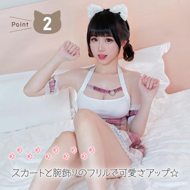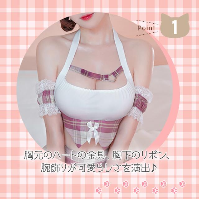 ピンクのタータンチェック柄でまとめたキュートな可愛らしい猫ちゃんメイドコスチューム4点セット。