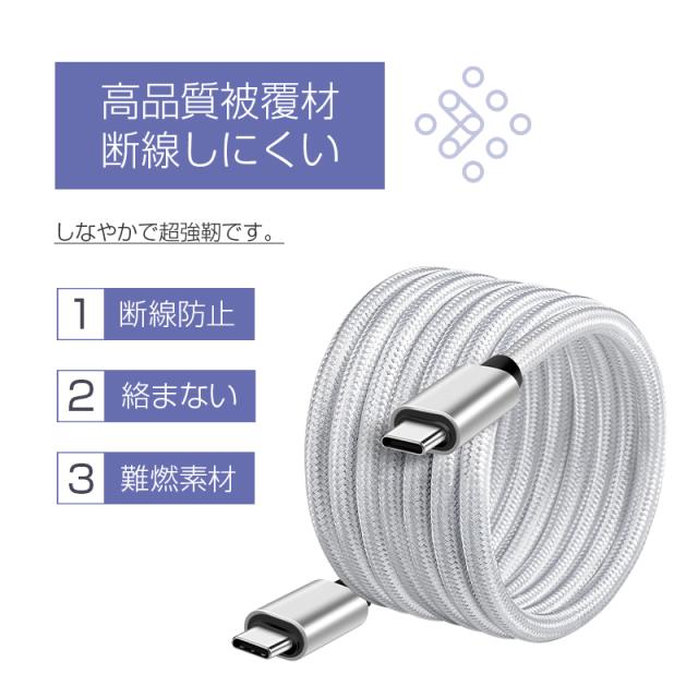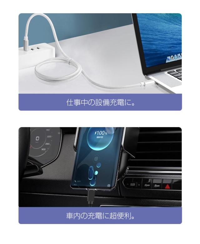 C to Cケーブルは最大60W「USB PD」対応、大きな電力を必要とするノートPCやモニターの充電ケーブルとしてもおすすめです。MacBookへの充電を行いたいなら、必ずこの両側タイプCのケーブルを!