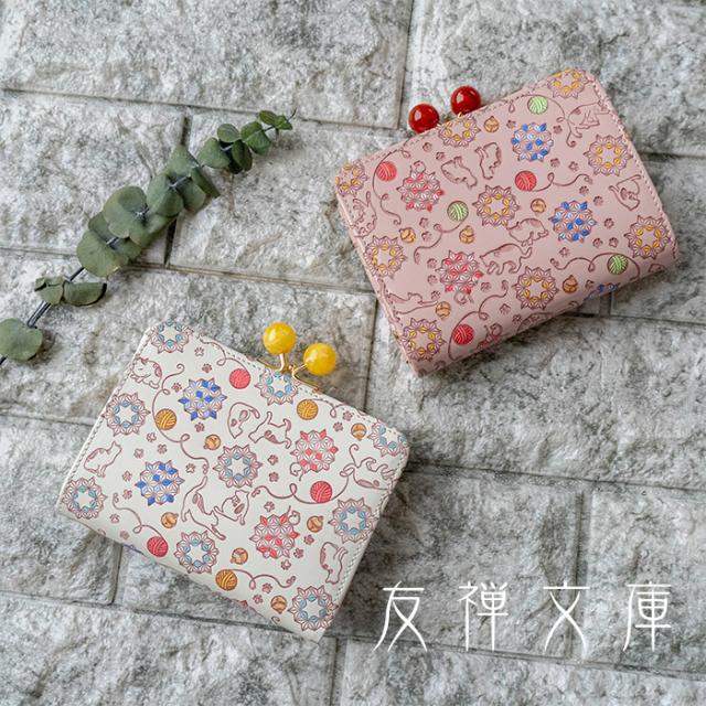 財布 レディース 二つ折り財布 がま口 口金 かわいい 厄除け 魔除け 縁起 麻の葉 和柄 和風 本革 日本製 猫柄 ねこ 手描き 猫遊び 友禅文庫 母の日 プレゼント クリスマス