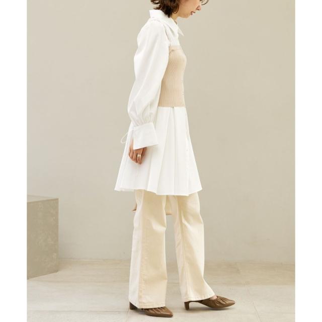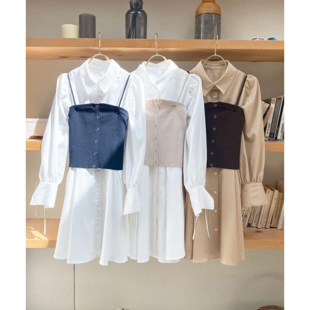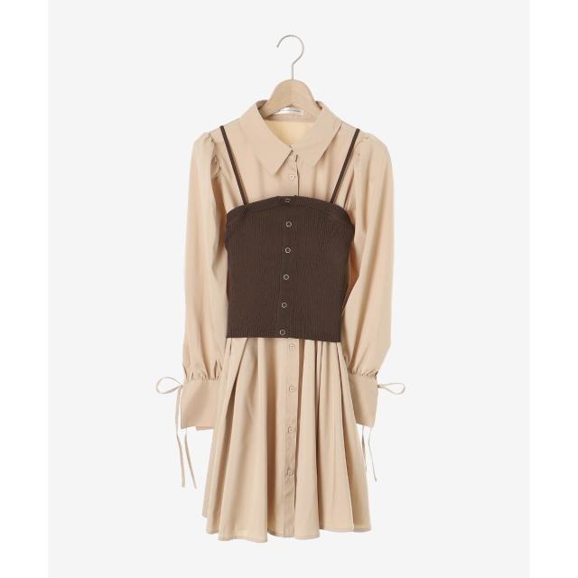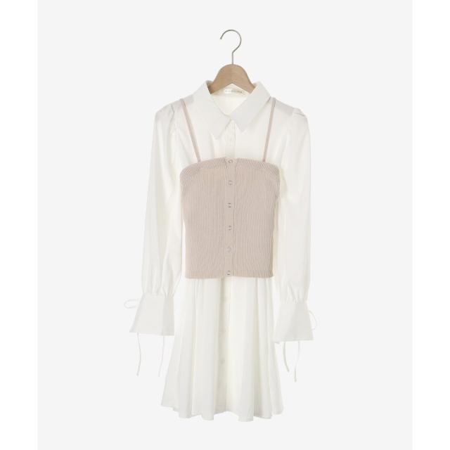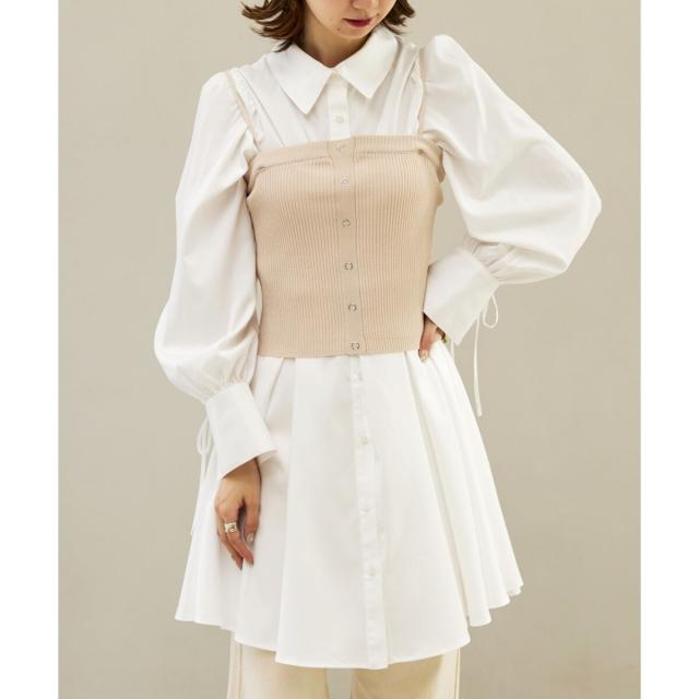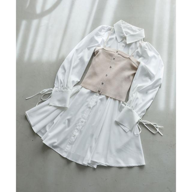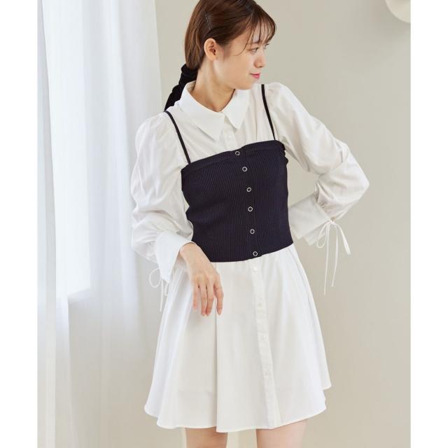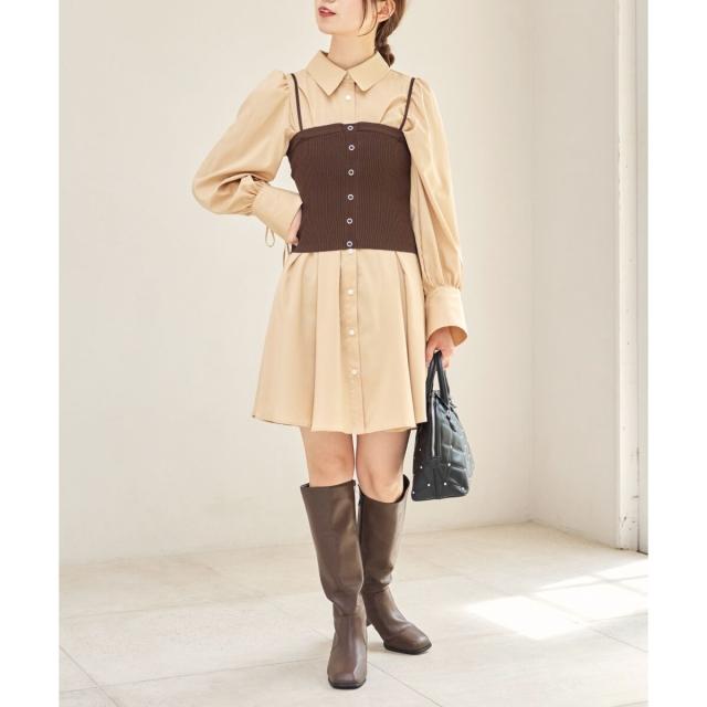 ミニシャツワンピとトレンドのリブニットビスチェがセットになったアイテム。