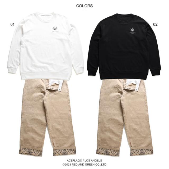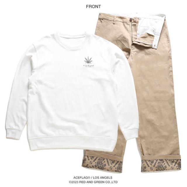 ACEFLAGを代表する「ヘンプ」をドロップした(上)がトレーナ—、(下)が裾にペイズリー柄を施したチノロングパンツの上下セット。