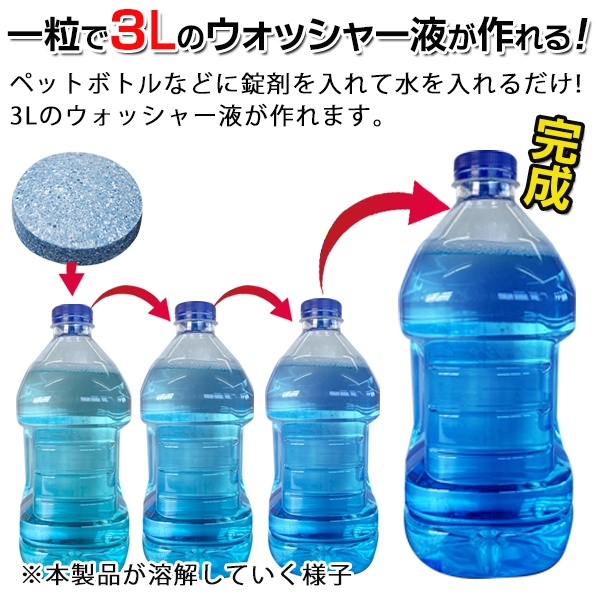 | ワイパーと連動してフロントガラスなどの汚れを落とすウォッシャー液!ペットボトルなどに錠剤を入れて水を入れるだけ!3Lのウォッシャー液が作れます。車用ウォッシャー液としてはもちろん、スプレー容器に入れて、窓ガラスの拭き掃除などにも使えます。 |