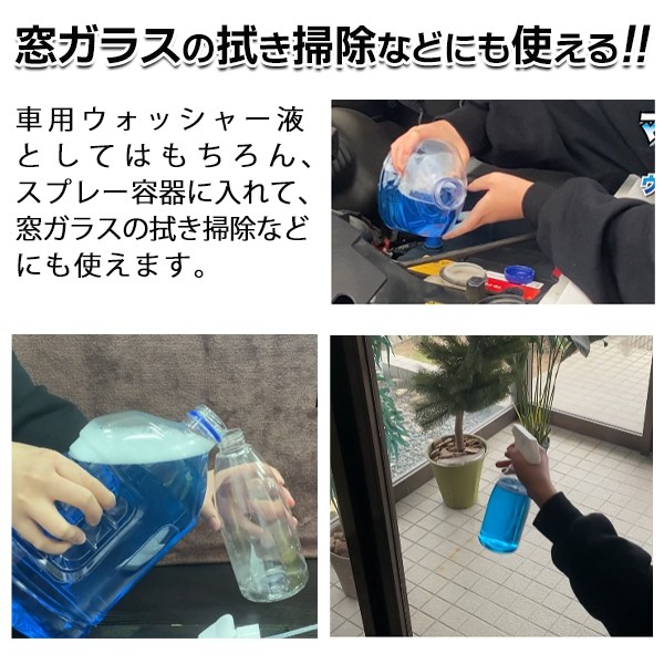 車用ウォッシャー液としてはもちろん、スプレー容器に入れて、窓ガラスの拭き掃除などにも使えます。