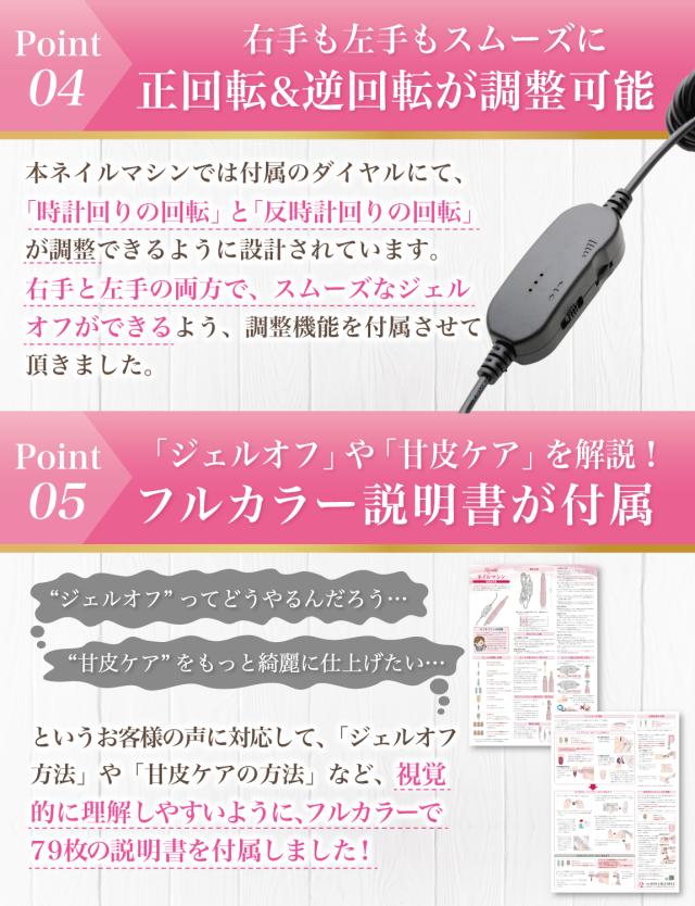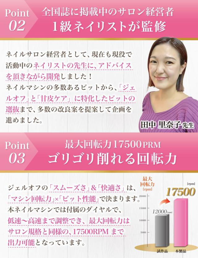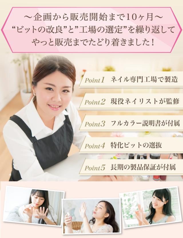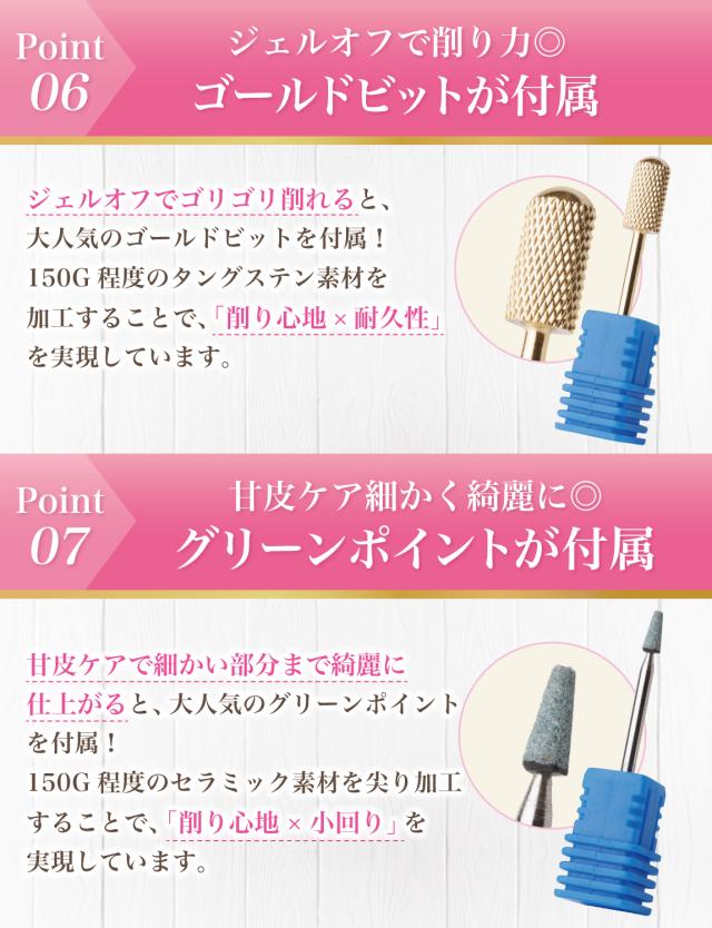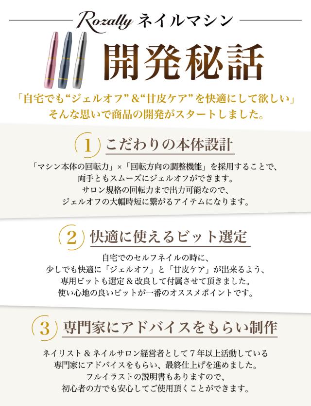 「ジェルネイル の オフ で ネイルファイル だとかなり時間がかかる…」「セルフネイル の ジェルオフ を時短したい…」「甘皮処理 や ネイルケア も ネイルマシン で済ませたい…」というお客様の声から生まれた 各種ビットが付属した の 電動ネイルマシン です。
