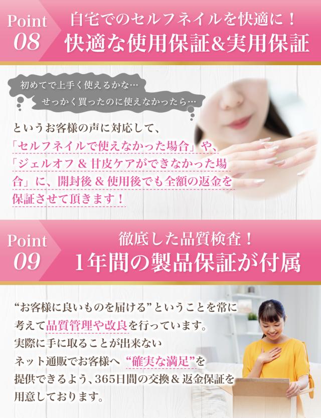 | Rozally 電動ネイルマシン は品質にこだわり、工場と交渉をおこなって素材選定から進めています。 出荷前の検品などは十分に行わせて頂いているのですが、輸送中に破損や汚れは混じってしまうケースがあります。 不具合などが発生してしまった場合でも、製品には1年間の長期保証を付属させて頂いておりますので、すぐに交換品の手配をさせて頂きます。 また本製品には使いやすさや快適さを実感して頂くことを最優先に考え、「2週間ほどなかなか上手く使用できなかった」という場合に、”開封後”でも”使用済み”でも全額の返金保証を付属させて頂いております。 |
