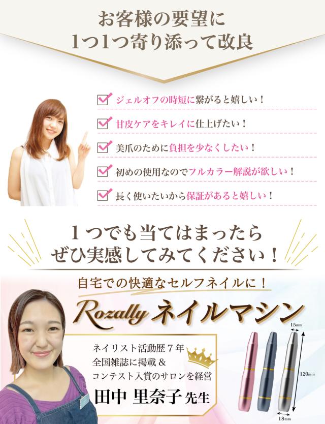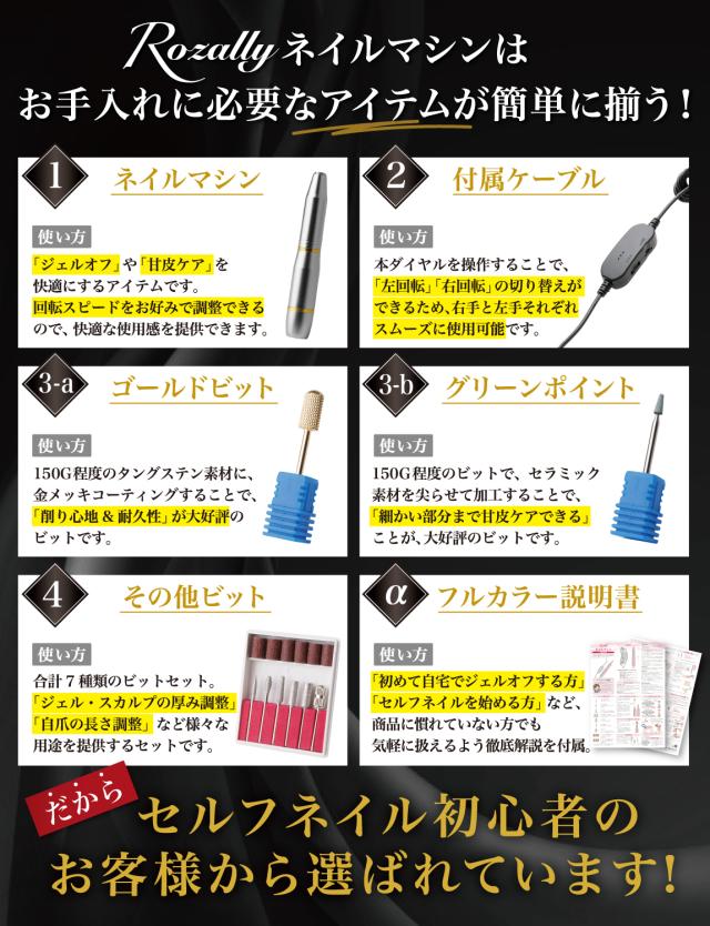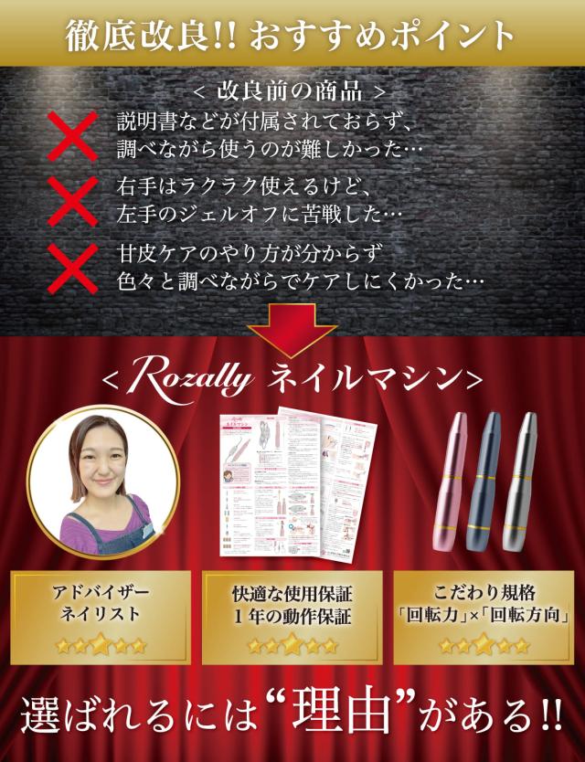 | Rozally 電動ネイルマシン ( 電動 ネイルマシン ) がついに正式販売開始。 「ジェルネイル の オフ で ネイルファイル だとかなり時間がかかる…」「セルフネイル の ジェルオフ を時短したい…」「甘皮処理 や ネイルケア も ネイルマシン で済ませたい…」というお客様の声から生まれた 各種ビットが付属した の 電動ネイルマシン です。 プロからの人気も高い「ゴールドビット(ジェルオフ用)」と「グリーンビット(甘皮ケア用)」 も付属してビットセットを企画させて頂きました。 企画&設計では ジェルネイル や ジェルオフ に詳しい【ネイリスト】の プロ からアドバイスをもらい、 ネイルマシン の使用方法 などフルイラスト説明書として添えさせて頂きました。 ※【 ネイルマシン URAWA ウラワ 】の商品ではありません。 |