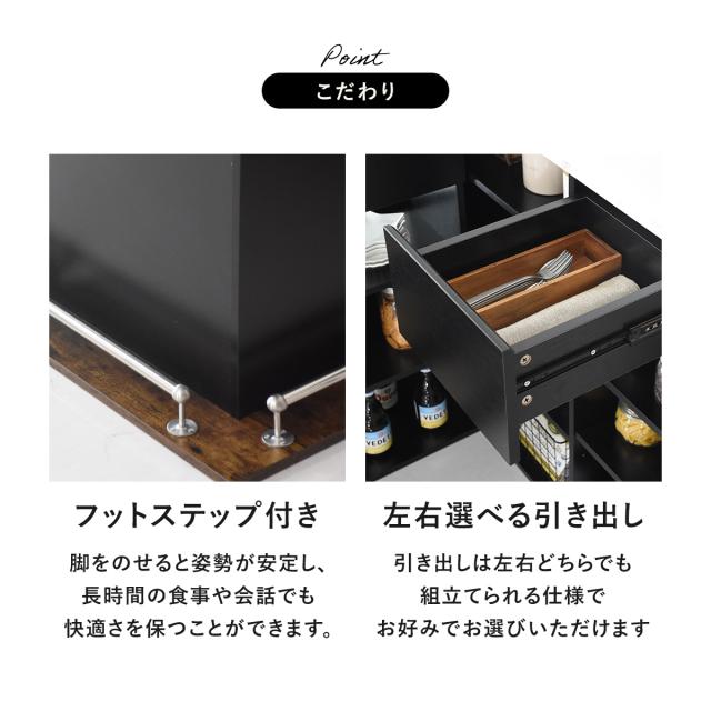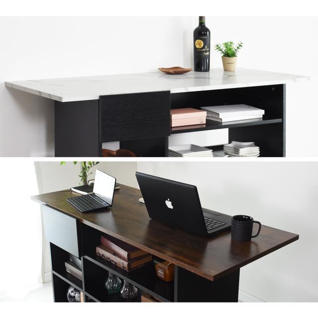 プラック基調のデザインが高級感を演出し、ヴィンテージと大理石調の天板がアクセントになったおしゃれなカウンターデスク「デューズベリー」。オープンな収納スペースと便利な引き出し完備で、キッチンカウンターやバーカウンターとして幅広くご使用いただけます。